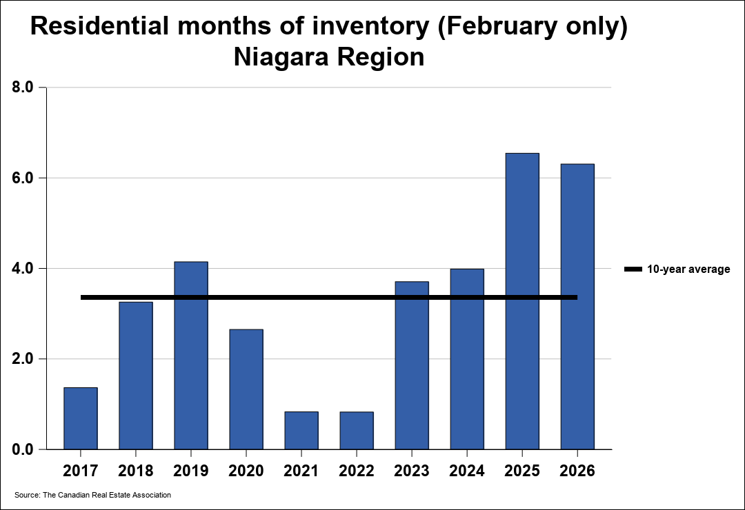 Months of inventory numbered 6.3 at the end of February 2026, down from the 6.5 months recorded at the end of February 2025 and above the long-run average of 3.4 months for this time of year. The number of months of inventory is the number of months it would take to sell current inventories at the current rate of sales activity.