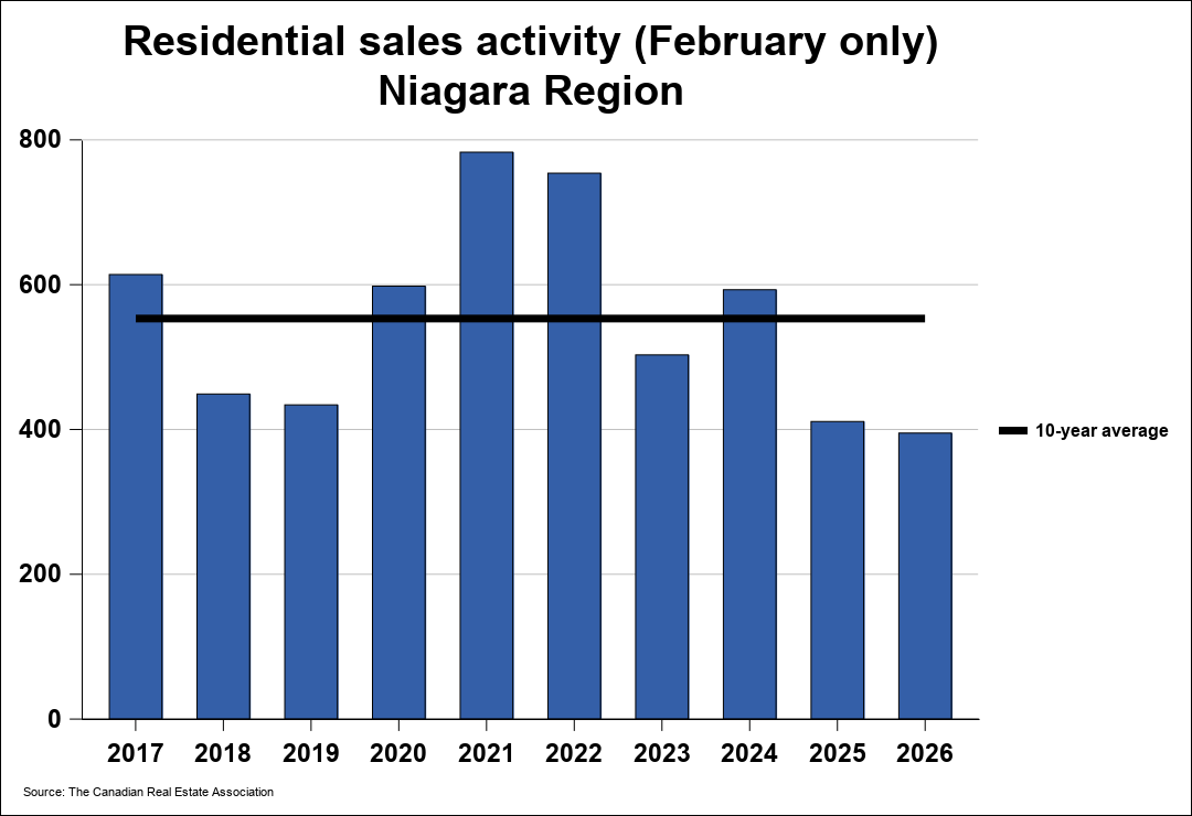 The number of homes sold through the MLS® System of the Niagara Association of REALTORS® (NAR) totaled 395 units in February 2026. This was a small reduction of 3.9% from February 2025.